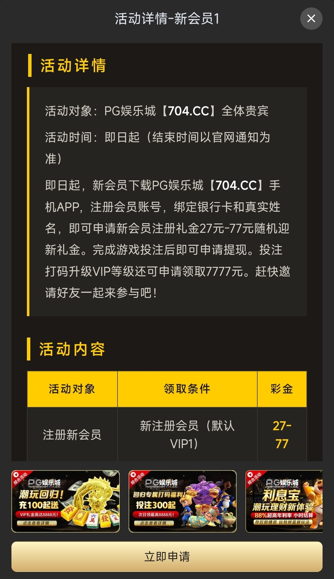 下载APP注册账号绑定银行卡跟姓名,在活动里找到“新手专属礼遇1”在里面申请,彩金5倍流水仅限娱乐PG电子,满100提现