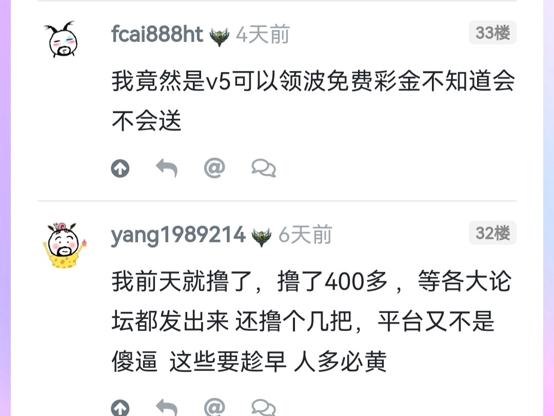 我前天就撸了,撸了400多 ,等各大论坛都发出来 还撸个几把,平台又不是傻逼  这些要趁早 人多必黄