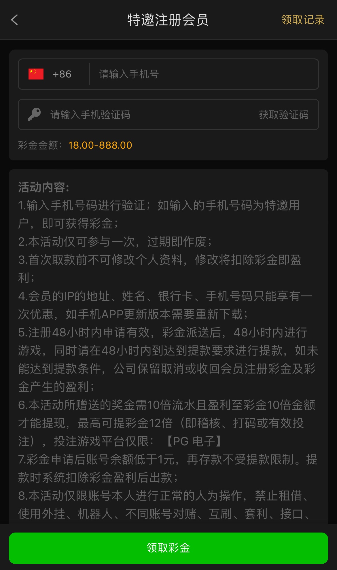 短信特邀碰瓷18彩金,注册绑定收款方式在优惠里自助领取,10倍流水,盈利彩金10倍金额才能提现,最高只能提彩金的12倍金额,就算不是特邀注册也送8彩金