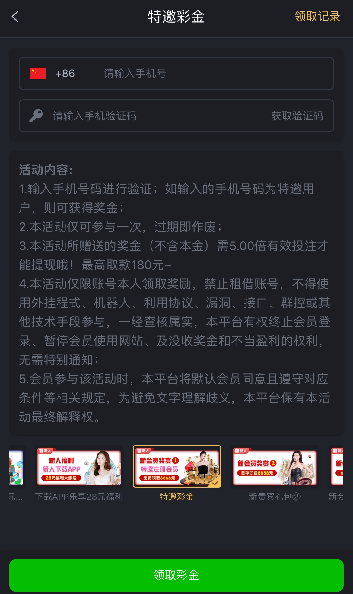 特邀碰瓷,注册完善资料,优惠自助申请,5倍流水,最高提180
