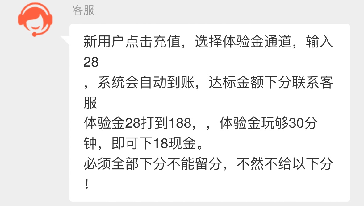 选择体验金通道,输入28 体验金28打到188,体验金玩够30分钟,下18现金
