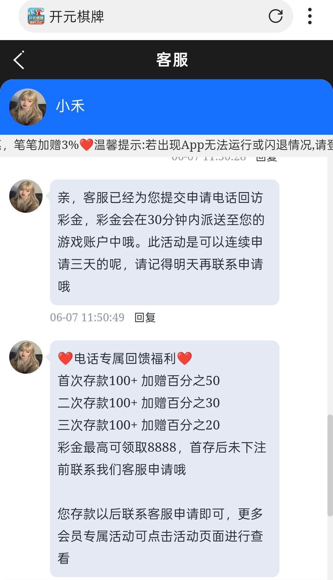 有号的兄弟可以去碰瓷一下回访彩金连送3天5彩金每天过了12点联系客服领取