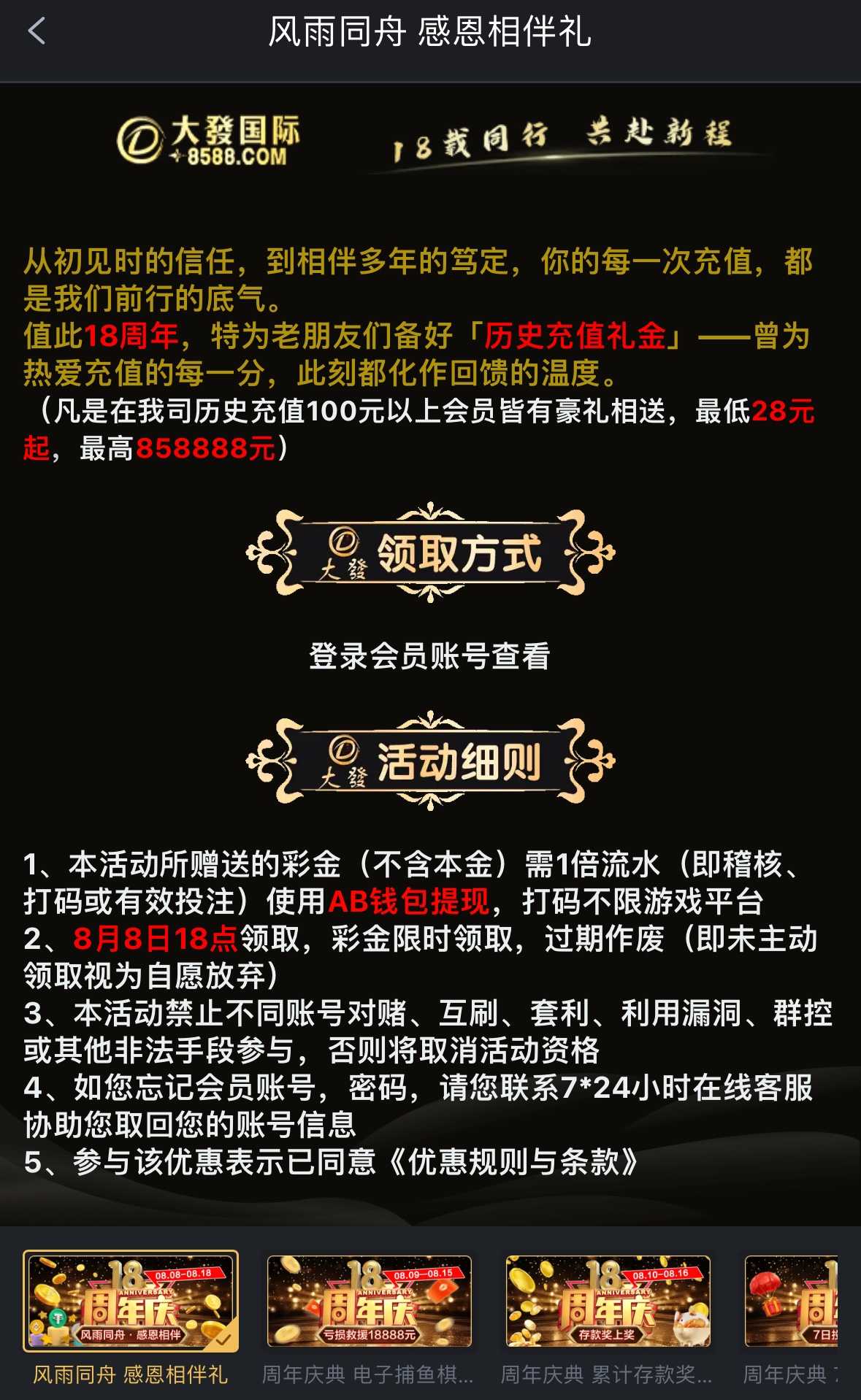 新用户/没充值过的无视,历史充值100以上的兄弟最低回馈28彩金,一倍流水,不限制游戏,仅限AB钱包提现