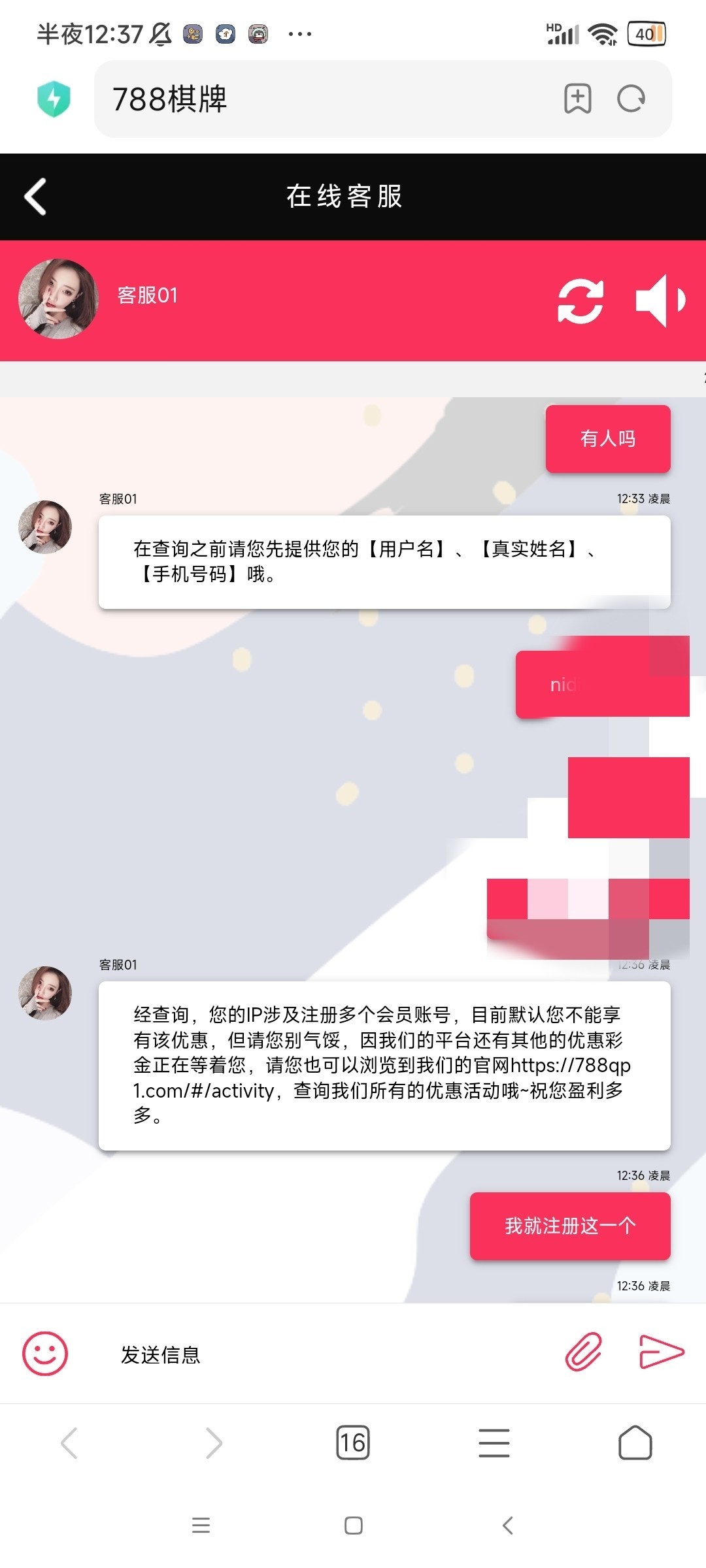 经查询,您的IP涉及注册多个会员账号,目前默认您不能享有该优惠,但请您别气馁,因我们的平台还有其他的优惠彩金正在等着您,请您也可以浏览到我们的官网https://788qp1.com/#/activity,查询我们所有的优惠活动哦~祝您盈利多多。