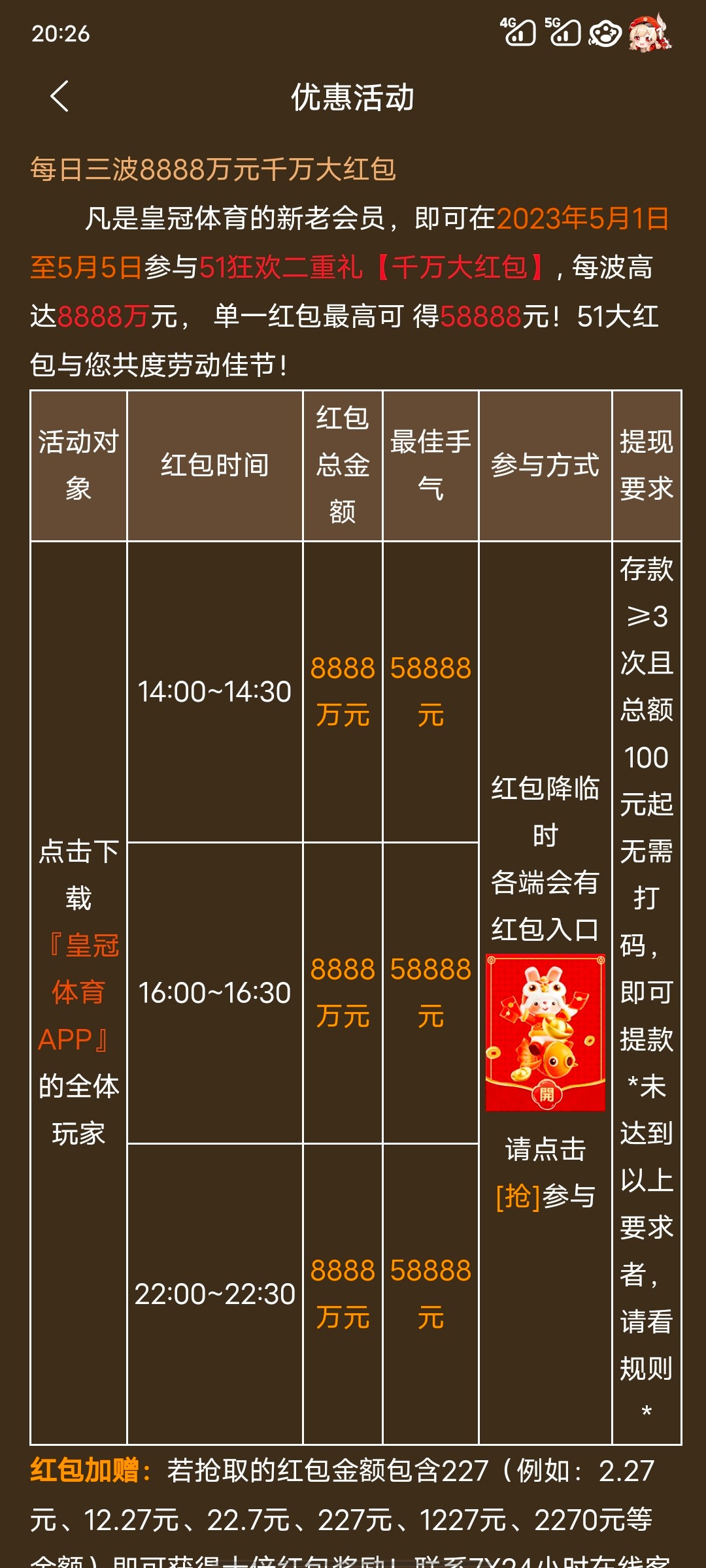 2、5.1日-5.5日三波红包派送14  16  22         充值过3次且总额达到100可直接提款没有就100提现