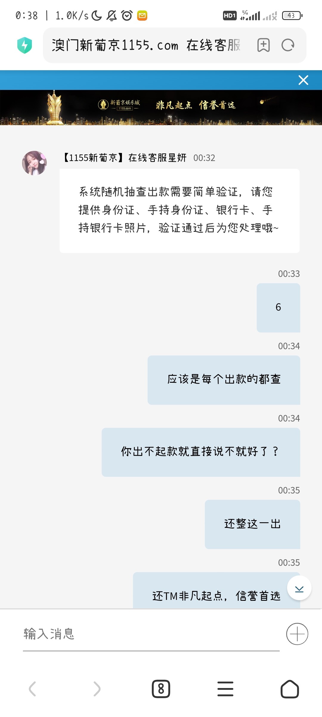 傻逼台,之前玩过,提现一直说我银行卡异常要求我换银行卡,最后给我空汇 6666