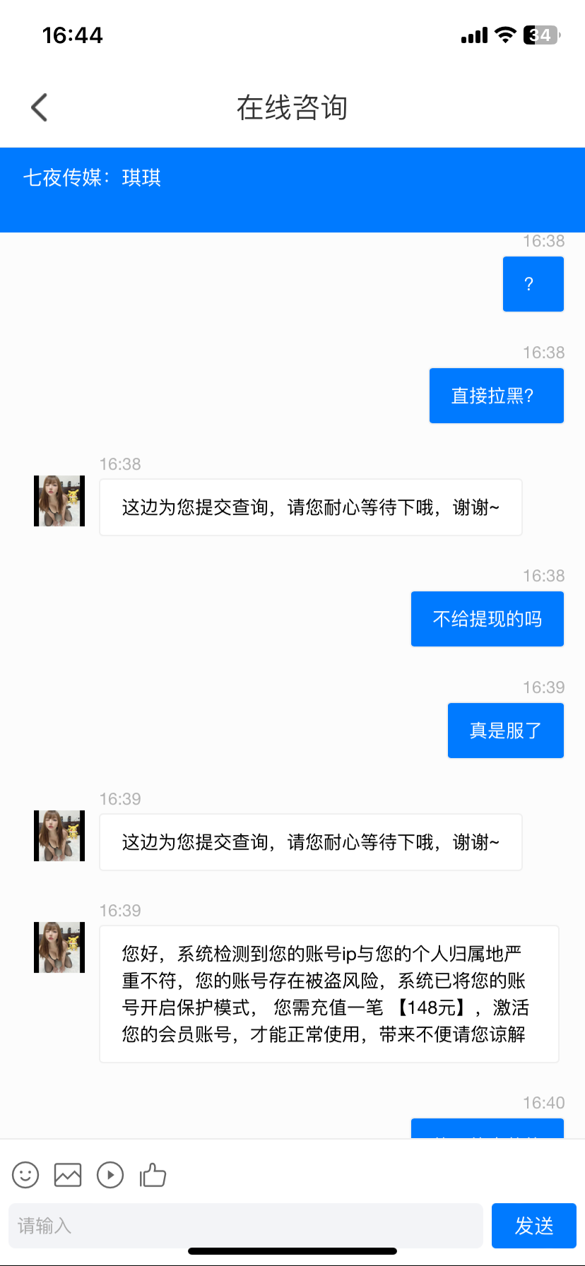 七夜是黑的 充了也不给你出 还让你继续充 不充就拉黑