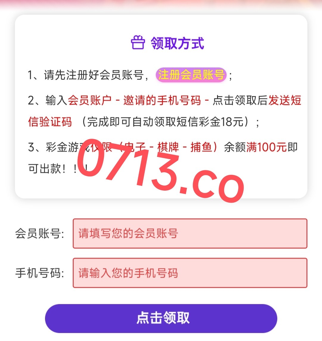 进网站随便输入一个账号 再输入自己手机号 是特邀的话再去注册 特邀碰瓷都去试试 还有下载app彩金 游戏和提款限制自行查看